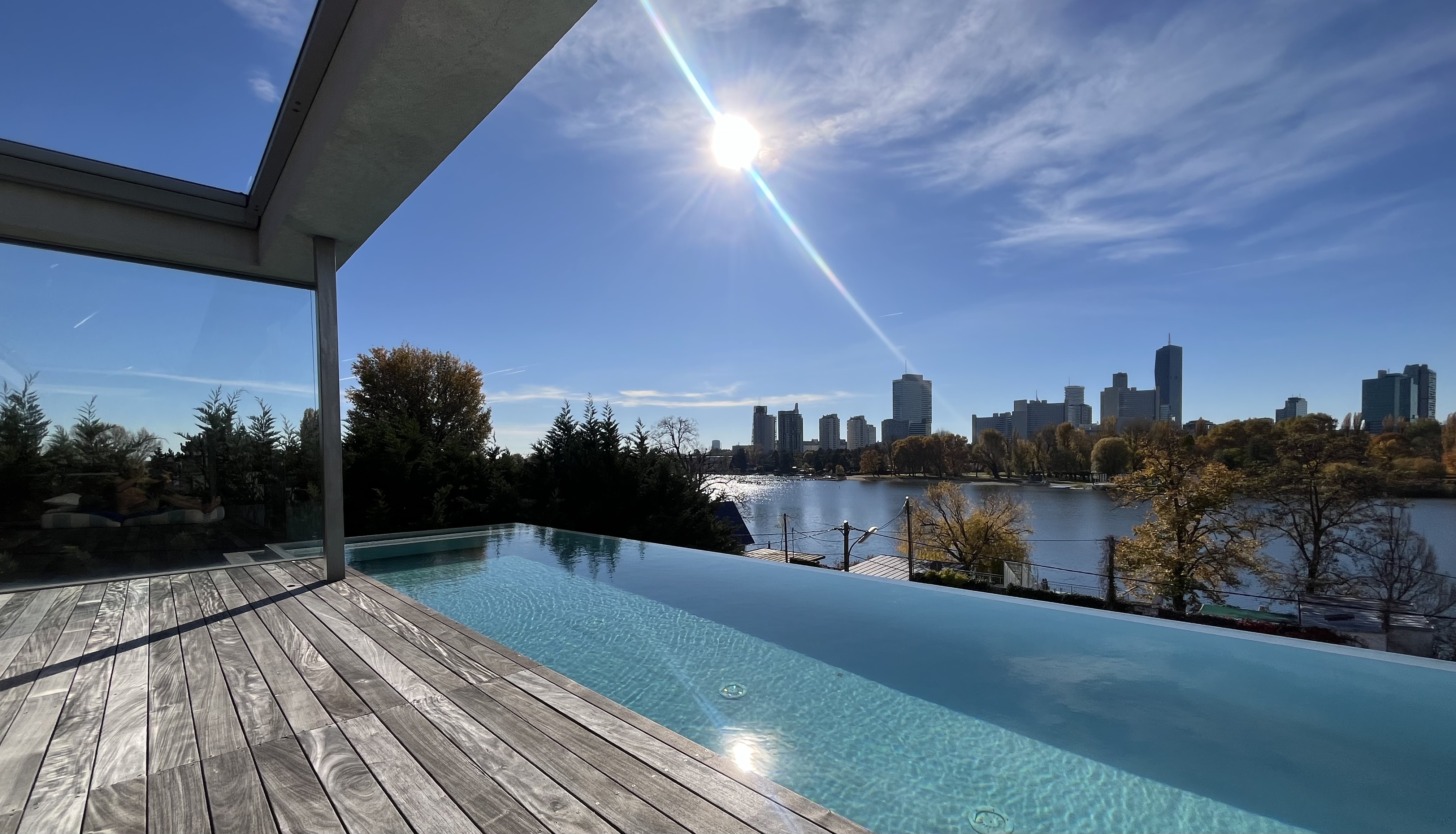 In den oberen Etagen entsteht eine besondere Wohngemeinschaft auf 300 m² mit privaten Rückzugsräumen, großzügigen Wohn- und Wellnessbereich und einem Infinity-Dachpool mit Blick auf die Alte Donau und die glitzernde Skyline von Wien.